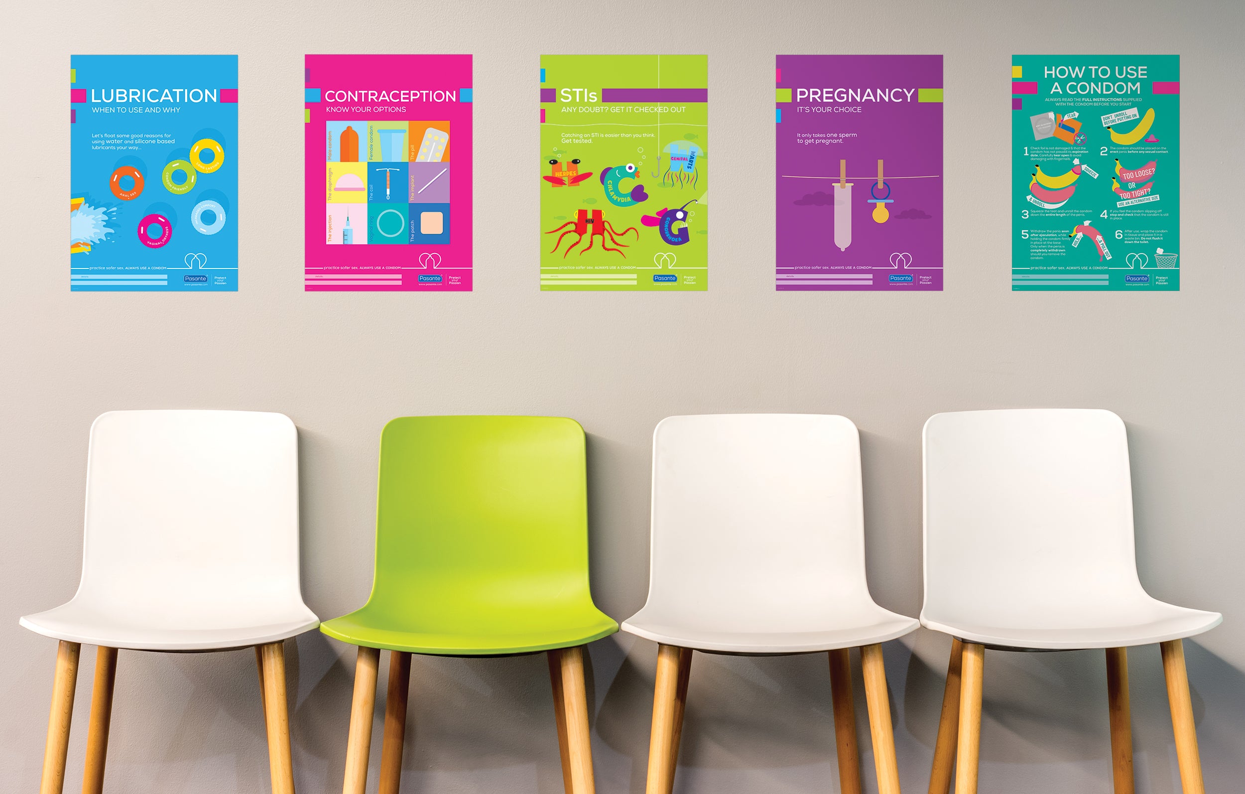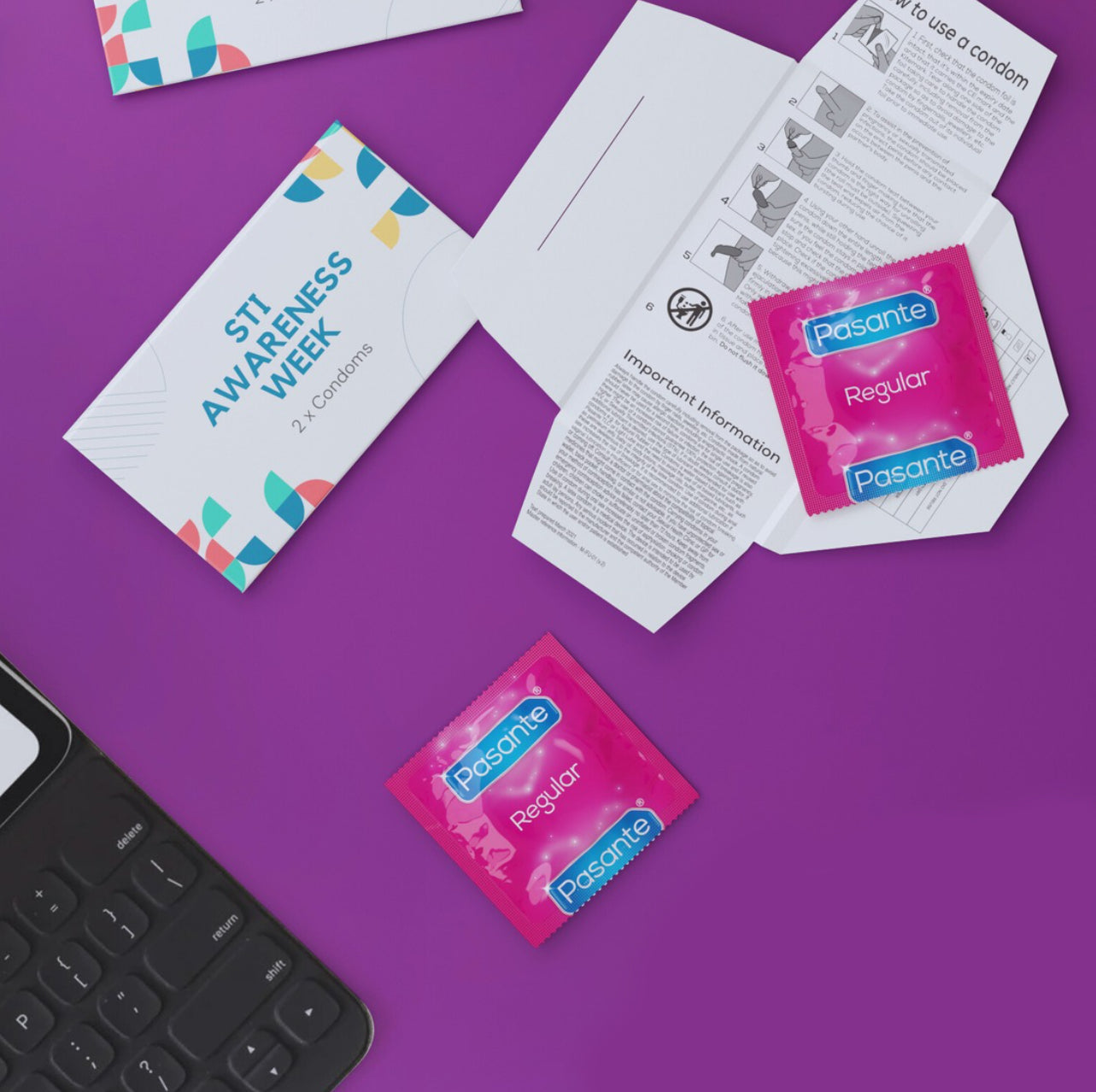 Promote your safer sex campaigns with our card condom wallets; the outside is printed with your bespoke branding and campaign messaging, with the inside containing 2 Pasante condoms and instructions on how they are used.